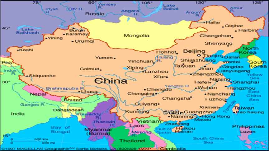 • Rivers: The Yangtze River is the 3rd largest in the world (6,300 km long) and the Yellow River, stretching 5,464 km.